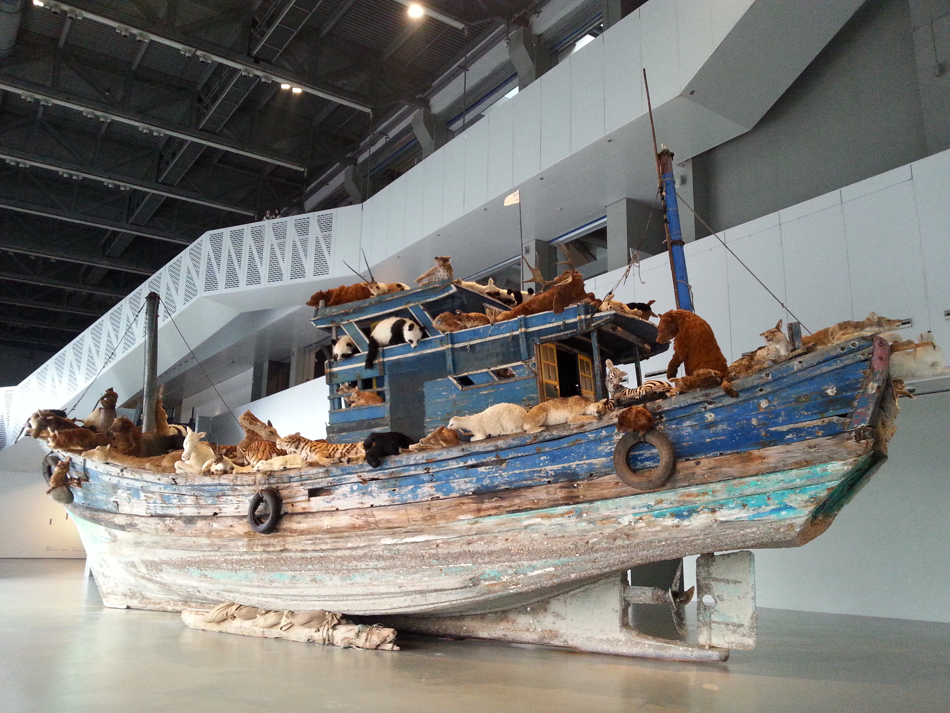 作为此次展览的主题作品《九级浪》早于7月17日沿着繁忙的黄浦江一路驶来,经过外滩两岸象征中国近现代化进程的地标群,抵达了上海当代艺术博物馆。这艘来自蔡国强家乡福建泉州的木船载着99只仿真动物,在饱经风霜的渔船上,老虎、熊猫、骆驼……大大小小凶猛温顺的动物们耷拉着脑袋,好像在时代的大风浪里晕了头。蔡国强表示,作品受俄罗斯画家艾伊瓦佐夫斯基的油画《九级浪》启发。它描绘了断桅上的人们战胜惊涛骇浪的无畏勇气和决心,表现了人与自然拼搏的顽强意志和壮观景象。蔡国强将其放置在原是发电厂的展厅里,意图反映中国最近的环境问题,引起人们对环保的重视。然浩浩荡荡地驶入黄浦江,进入当代艺术博物馆的这件装置作品只因体积巨大对观者产生视觉冲击,却并未能让人理解到其中所谓环保的深意。