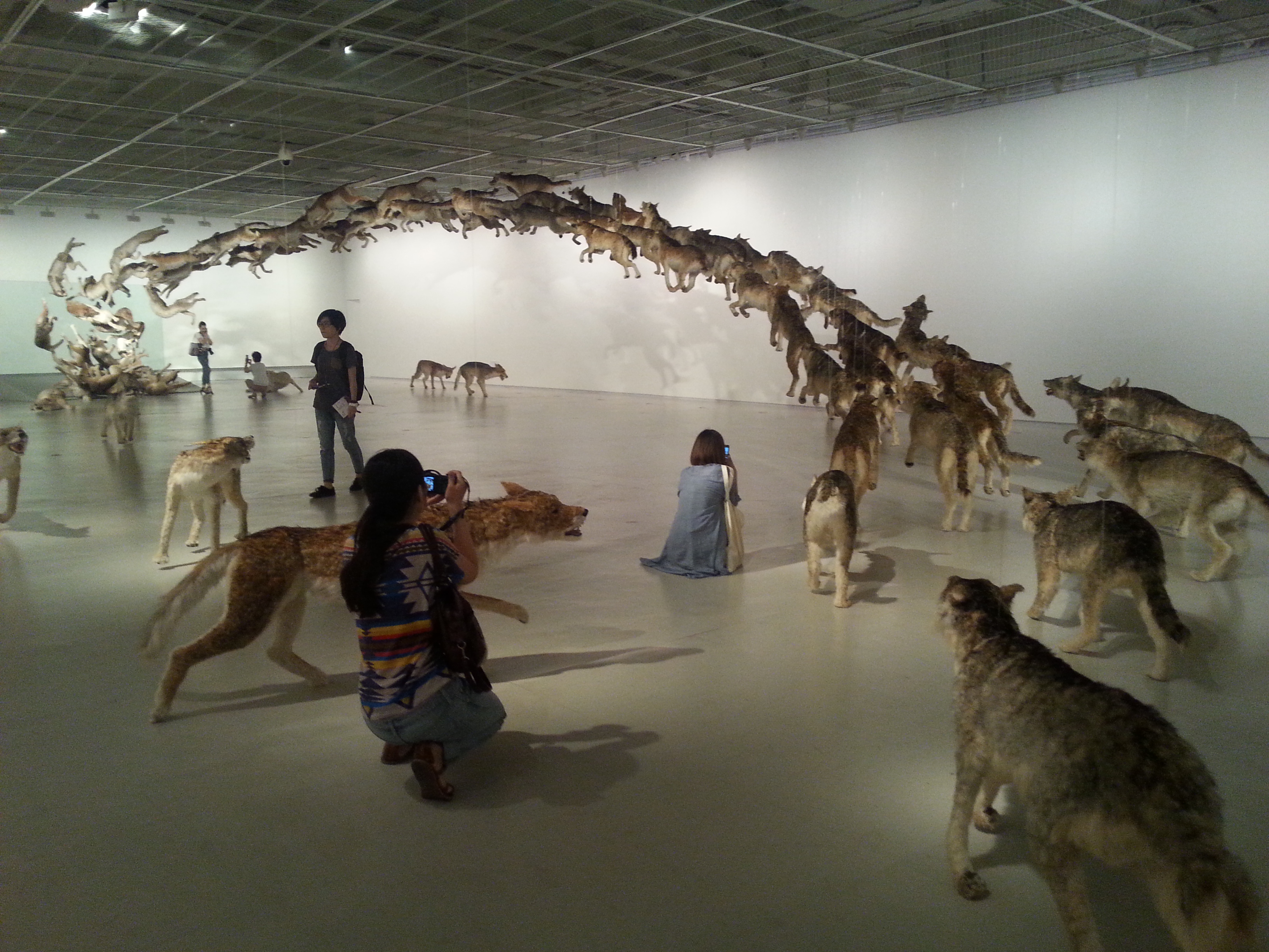 《撞墙》受德意志银行委托为柏林德意志古根海姆美术馆2006年的展览制作,是艺术家世界巡展的代表作之一。99只狼将自己投掷到空中,义无反顾撞向一面透明玻璃墙,再滚落地面折返,循环往复,借助中国传统卷轴画的平面散点透视法,实现立体装置的全景呈现。作品灵感来自柏林动荡的历史,狼群撞向的玻璃墙与冷战时期分隔东、西柏林的墙体一般高,试图表现看得见的柏林墙易除,人与人或文化间无形的隔阂却难以消解。这件大型装置作品给观者一种身临其境的震撼感,当你身处狼群中时,细观那一匹匹前仆后继撞着玻璃墙的狼群时,不禁反思自身,人类有时就似这些狼。大型装置艺术的互动性使得作品的感染力传达得更加深入,《撞墙》的互动性使其远比《九级浪》带给人的触动大。