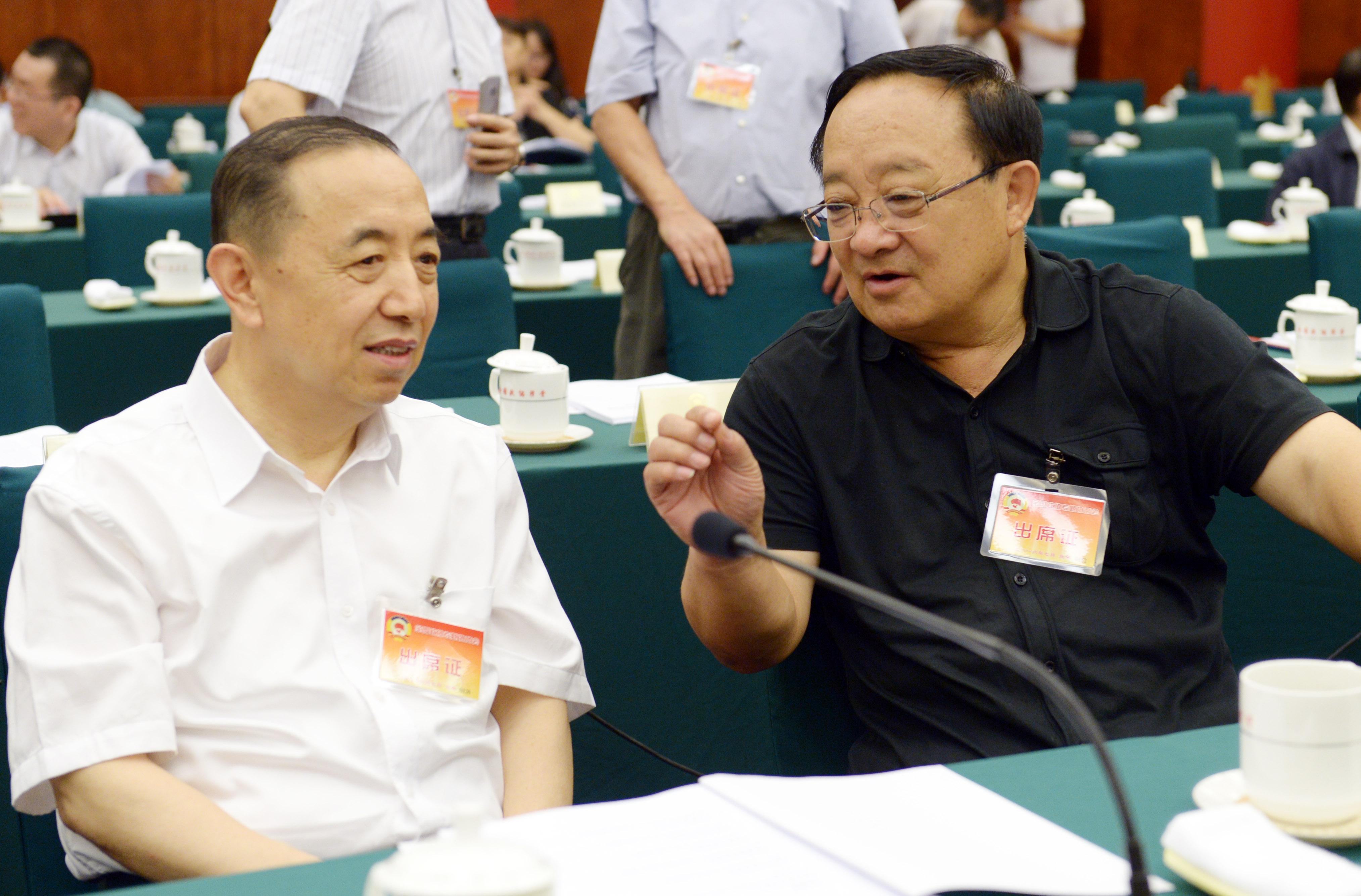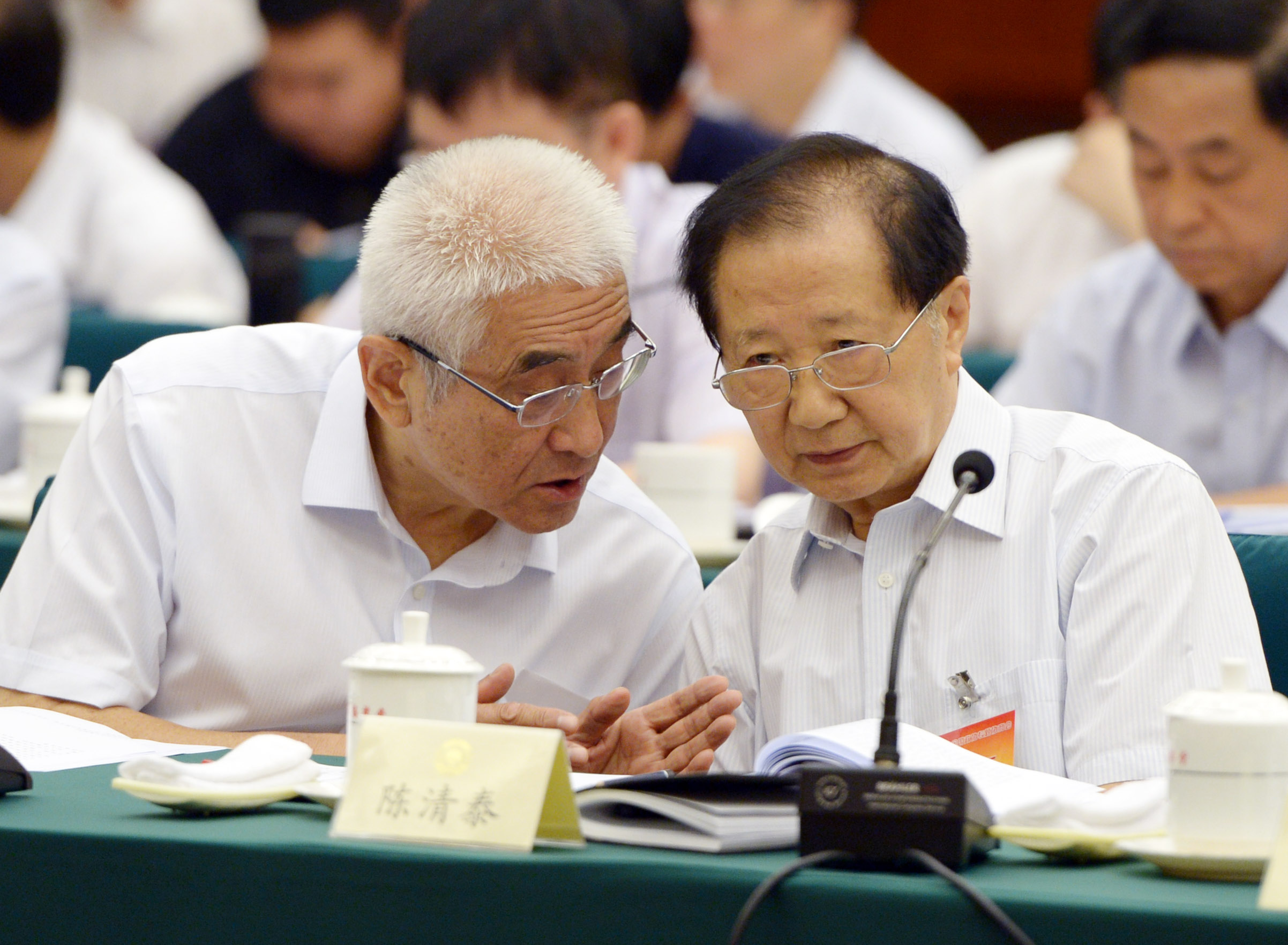 刘克崮(左)和陈清泰在一起交谈。