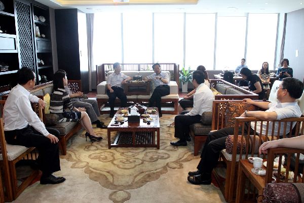 青年企业家会员陈星言是新东苑国际投资集团有限公司总裁,在今年的换届选举中被选为民建闵行区委副主委,也是民建市委16个区县组织领导班子成员中最年轻的一位。她首先介绍了公司发展情况和公司近期投资项目的经营状况,并着重介绍了公司重点投资项目“快乐家园”的建造理念、整体布局、优势特色等情况。陈昌智不时询问公司投资项目的目标市场定位和战略规划,并鼓励陈星言作为年轻人秉持创新理念投身养老事业,责任重大,要遵循市场规律,坚持市场定位和品牌战略,边做边学,谋求更大的社会合作战略布局。