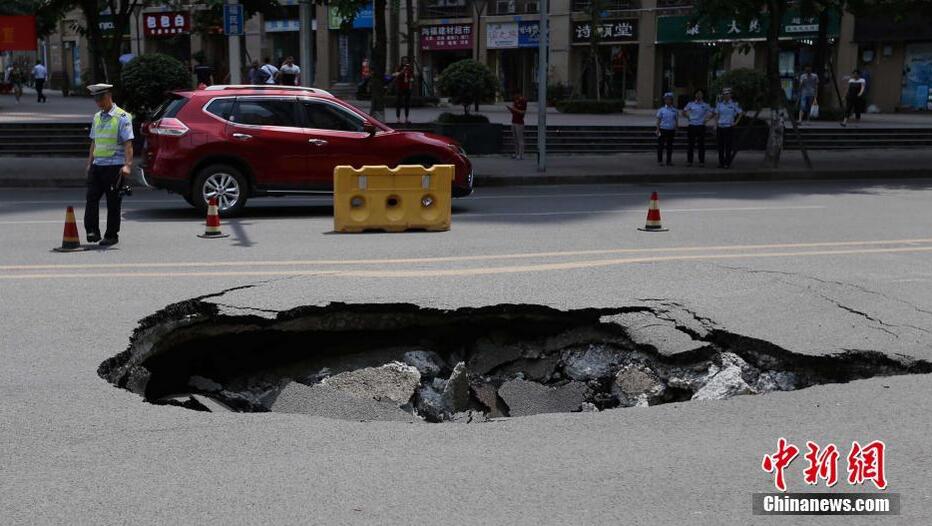 7月22日,重庆市南岸区弹子石腾龙大道与福民路路口附近路段突然塌陷,路面出现一个大坑。据现场目击市民称,事发时间为当日下午13时50分左右,最开始该路段只有一小块路面塌陷,几分钟后垮塌路面出现了一个大坑。目前,当地交巡警、市政等部门已在第一时间设置了警示标志,请市民和过往车辆避让行走,注意安全。图为塌陷路面。 中新社记者 钟欣 摄