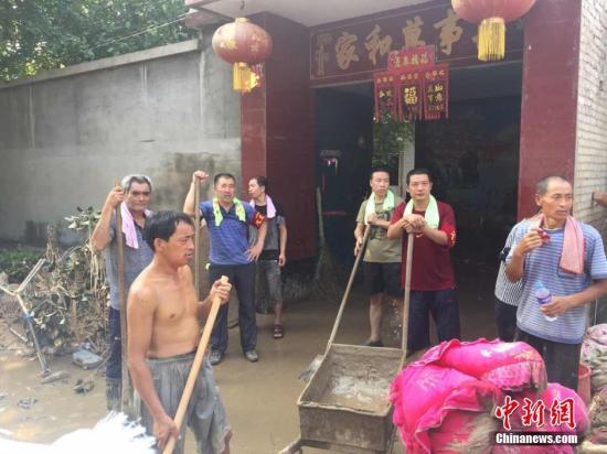 23日,记者实地探访受暴雨洪灾影响最深的河北省邢台市12个进水村。记者第一站到的是大贤村,该村紧邻七里河,也是网上流传的“七里河洪水漫过河堤决口,开发区12个村进水”中的一个村落。记者在受灾现场看到,众多房屋受损严重,屋内满是泥浆,房屋墙壁上至今留着洪水退去后的水渍痕迹,其中最高的水渍有两米。图为乡里组织的志愿者在为村民打扫院子。张鹏翔 摄
