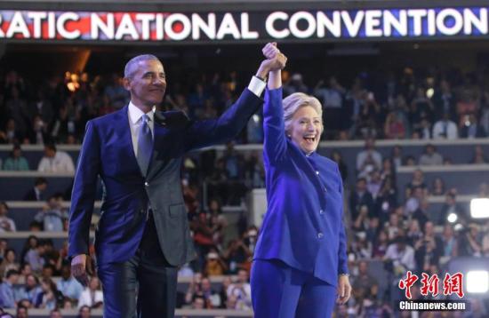 当地时间7月27日,美国民主党全国代表大会在费城继续举行,美国总统奥巴马登场为希拉里助选造势。奥巴马演讲结束后,希拉里与奥巴马同台亮相。 中新社记者 廖攀 摄