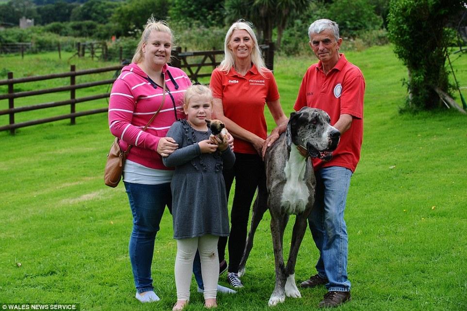 站在娜塔莉身边的是她6岁的女儿萨莫,她们与戴恩的主人威廉姆斯站在一起合影留念。