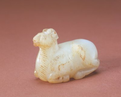玉羊的造型自商代即已出现,汉代时圆雕玉羊的造型已十分准确,多为静态卧形,身体肥硕,背部丰满,短颈,嘴部似榫凸,羊角雕琢细致,大而夸张,一般向下盘旋弯曲,羊身上多有阴线细纹为饰。此类玉羊用作玉镇或陈设品。