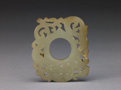 玉为青色。大致呈片状,中间有一孔,孔外周镂雕螭纹。