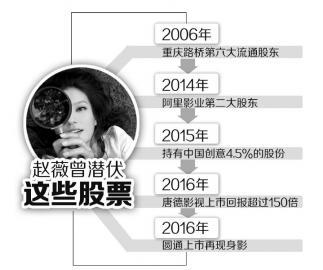 圆通速递借壳上市后,有机构经过计算,阿里创投在圆通上市后富盈将达数十亿元。而作为云锋新创的股东之一,赵薇当初出资7500万元,持股2.4422%,预计圆通上市后,赵薇又将获利数千万元。