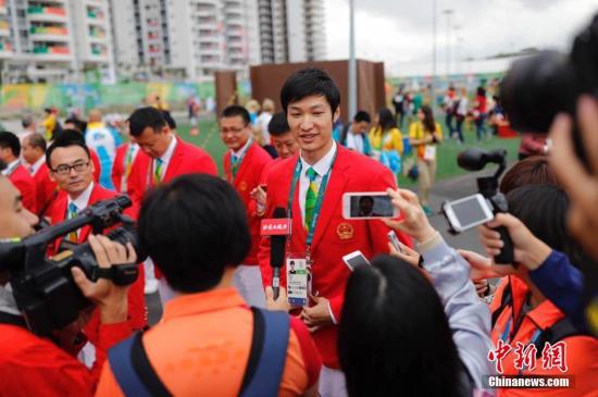 当地时间8月3日上午9时30分,中国奥运代表团在里约奥运村举行升旗仪式。图为中国击剑队男子花剑运动员雷声接受媒体采访。中新网记者 盛佳鹏 摄