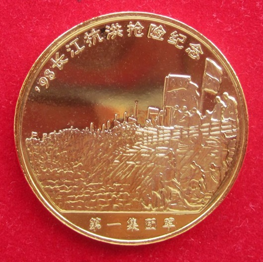 而在九江长江城防大堤堵口决战中,中国人民解放军第一集团军与地方干部群众一道团结拼搏,谱写了一曲壮丽的凯歌,为弘扬伟大的抗洪精神,第一集团军特制作“98长江抗洪抢险纪念章”,该章直径4cm,呈圆形,铜镀金,正面图案根据九江封堵决口的情景缩绘而成,真实地再现了当时惊心动魄的抗洪抢险场面,讴歌了百万军民奋不顾身、舍生忘死的壮举。气势恢宏的画面,给人强烈的视觉冲击力和震撼力;背面铭有“万众一心、众志成城、不怕困难、顽强拼搏、坚韧不拔、敢于胜利”的字样,圆内四周城墙修饰,寓意官兵用血肉之躯筑起的钢铁长城。