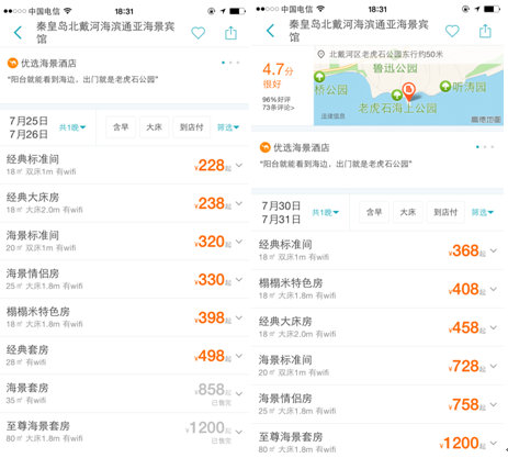 去哪儿网工作人员表示,由于北戴河地处距北京不到300公里,多数北京游客选择周末出游,造成房源紧张等现象,也导致周末酒店价格上扬。