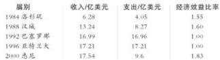 比率小于1,即为亏损;超过1,即为盈余。自1984年洛杉矶奥运会开始,各届的经济效益比率均超过或达到1,说明各届奥运会都没有亏损。