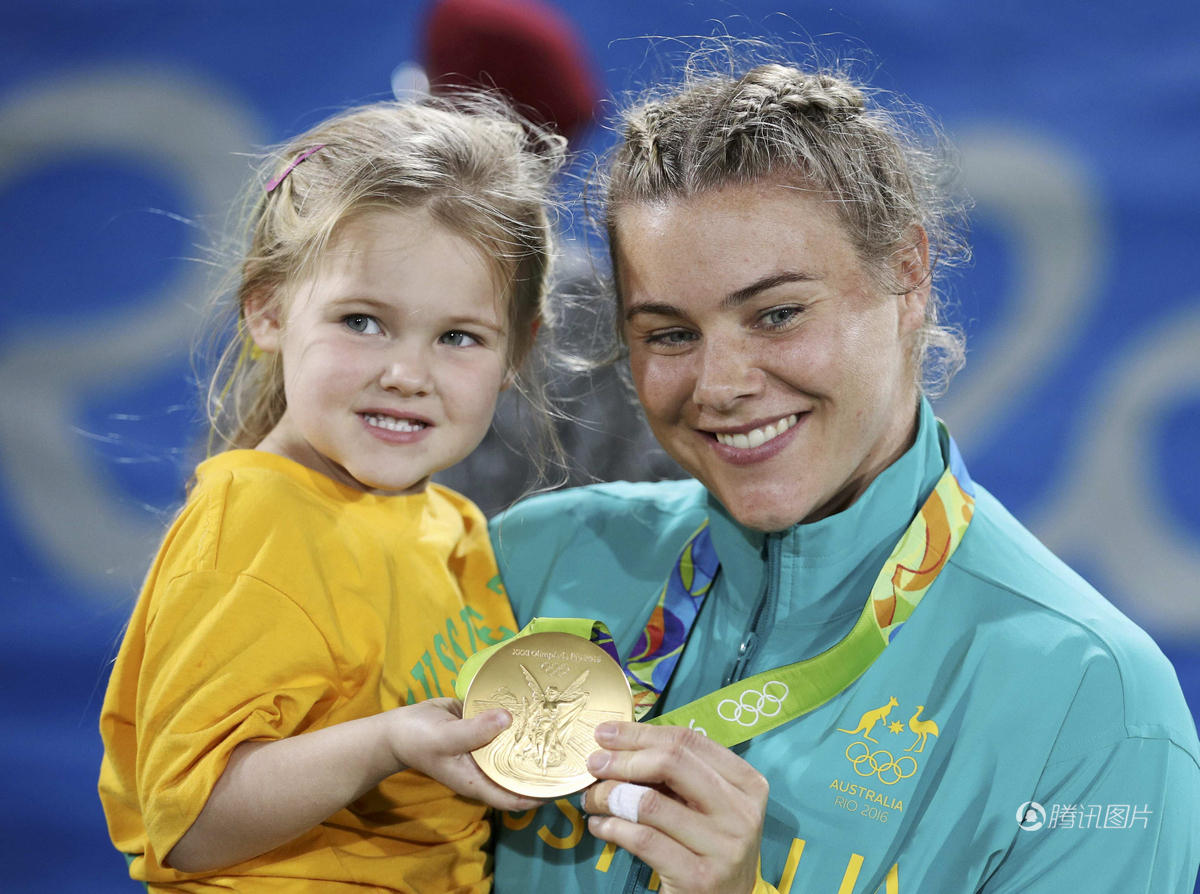 8月8日,里约奥运会女子7人制橄榄球决赛,澳大利亚队以24:17击败新西兰队,赢得奥运历史上首枚女子橄榄球金牌。颁奖仪式上,澳大利亚队员妮科尔-贝克与3岁女儿索菲一同分享冠军的喜悦。