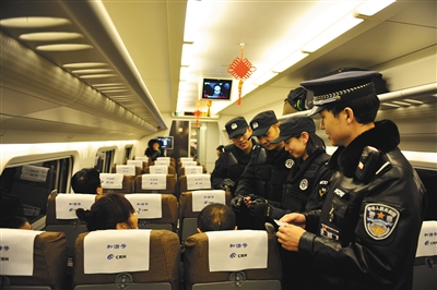 2015年1月8日,在呼和浩特开往包头的动车上,呼和浩特铁路公安处乘警正在对旅客的身份证进行查验。