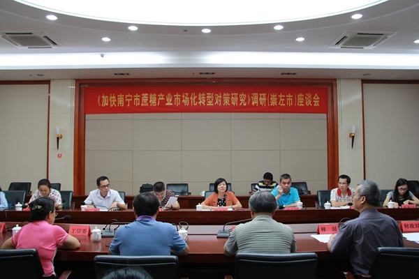 座谈会上,崇左市工信委、农业局、糖业办、财政局等部门分别介绍了在糖业发展方面的基本情况、主要措施和成效以及获得的经验;中粮屯河崇左糖业公司、东亚糖业崇左公司就争取国家、自治区更多政策扶持方面提出了意见建议。与会的课题组成员就所关心的土壤环境?;ぁ⒄崆芾?、甘蔗定价机制、市场化运作、互联网+糖业的发展等问题与参会各部门代表进行了深入的探讨和交流。致公党南宁市委会主委蒋晓筠在讲话时指出,蔗糖产业是我们的传统特色产业,如何通过体制机制创新保持蔗糖产业健康有序地发展,事关财政收入、农民增收、工人就业稳定的社会安定大局。她希望调研组把在区市内外调研获得的数据、资料和建议加以科学整理,认真分析,将先进地区糖业市场化转型、产业化发展的成功经验融入报告中,为加快建立糖企、蔗农、政府、金融利益共同体机制,实现农民增收、企业增效、社会稳定多赢局面提供科学、可操作的意见建议。