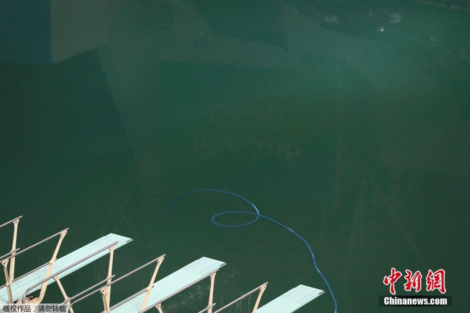 2016年8月14日,巴西里约热内卢,2016里约奥运会,奥运会游泳比赛结束,工作人员抓紧给游泳换水,以迎接接下来开始的花样游泳比赛。
