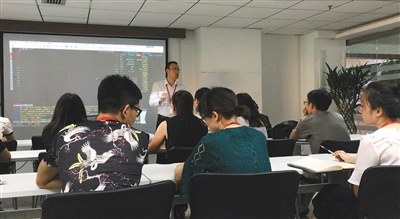 7月底的一次晨会,一位巨丰投顾“分析师助理”在向业务员讲解股市知识。