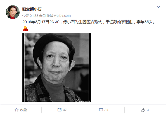 昨天晚上十一点半,傅抱石长子傅小石的个人微博发布了傅小石先生辞世的消息。微博写道:“傅小石先生因医治无效,于江苏南京逝世,享年85岁?!?/p>