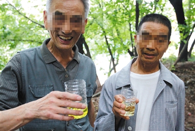 2014年6月24日,重庆两位有10多年尿疗经历的老人手持自己刚接的尿液。图/视觉中国