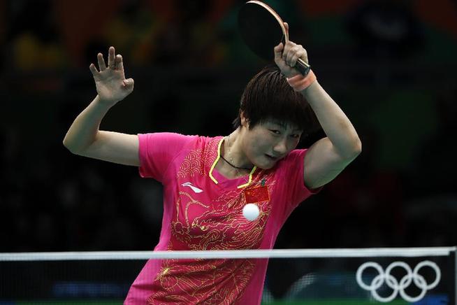 8月10日,丁宁在比赛中。当日,在2016年里约奥运会乒乓球女单决赛中,中国选手丁宁4比3战胜同胞李晓霞,夺得冠军。 新华社记者沈伯韩摄