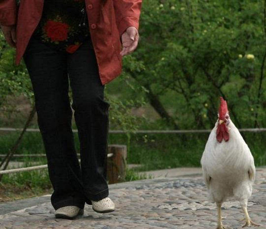 长春市儿童公园绿地上秦女士正在遛她的宠物鸡“乖乖”。