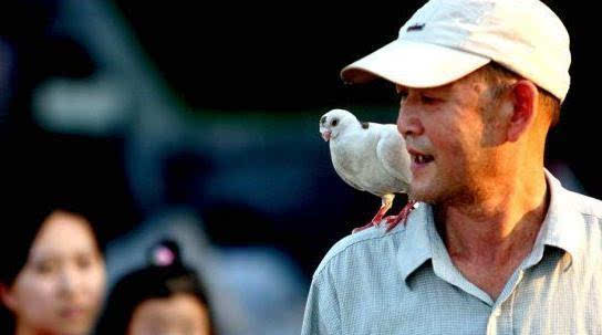 北京朝阳区农光里小区,主人在前面走,一只黄白相间的小鸽子迈着内八字紧随其后。