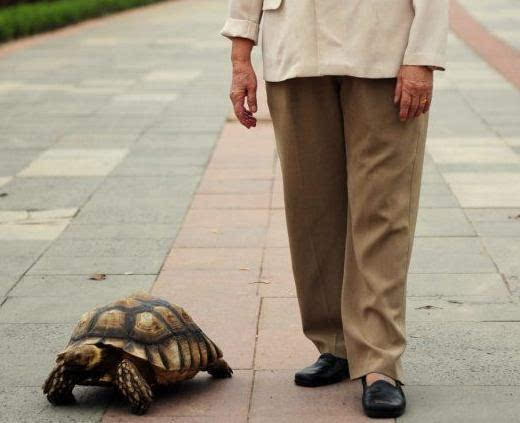 海南琼海,蒙大姐陪乌龟一起“散步”。