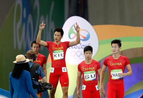 8月19日,中国队选手汤星强、谢震业、苏炳添与张培萌(从左至右)在比赛前出场。当日,在2016年里约奥运会田径男子4x100米接力决赛中,中国队以37秒90的成绩获得第四名。 新华社记者王丽莉摄