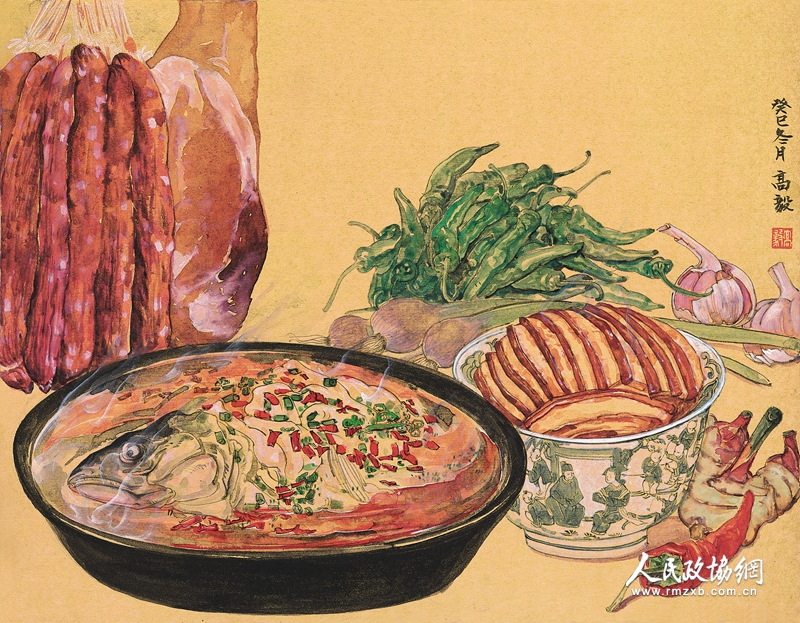 此外,高毅副教授的物味系列作品,最初是作为《三联生活周刊》2014年年货专刊的封面与插图,描绘的是我们日常生活中的系列美食,如大虾、螃蟹、腊肉等等。她以线描勾勒铁锅与盘子以及食物的轮廓形态,有的硬朗,有的松软,依照事物本身形体,在敷色上异常细腻,层次异常丰富。哪怕看似一种颜色,比如红色的肉,都有着细微的层次变化,而且在盘子与碟子的图案上还保留了古代的情韵。这一幅幅风俗画,却留住了我们日常生活美妙的停顿时刻。