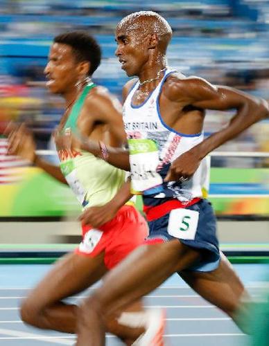 8月20日,法拉赫(右)在比赛中。 当日,在2016年里约奥运会田径男子5000米决赛中,英国选手法拉赫以13分03秒30的成绩夺冠。新华社记者王丽莉摄