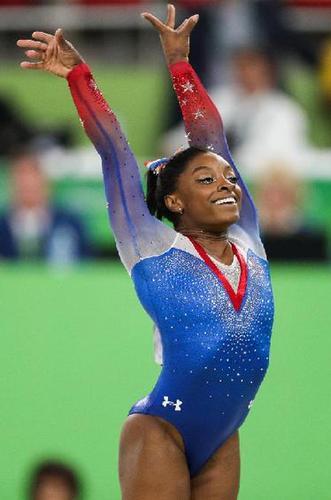 8月16日,美国选手拜尔斯在比赛中。 当天,在2016年里约奥运会女子自由体操决赛中,美国选手拜尔斯以15.966分的成绩获得金牌。新华社记者郑焕松摄