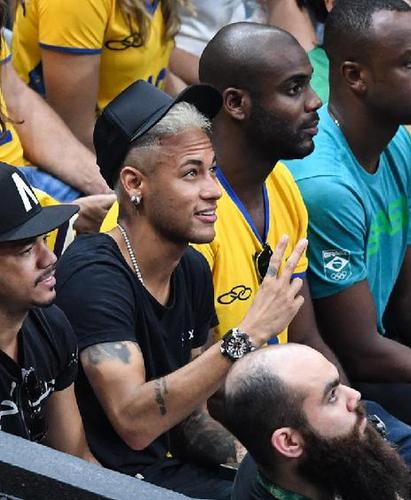 8月21日,巴西球星内马尔(中)在男排决赛赛场为巴西队加油助威。当日,在2016年里约奥运会男子排球决赛中,巴西队以3比0战胜意大利队,夺得冠军。意大利队和美国队分获亚、季军。 新华社记者刘大伟摄