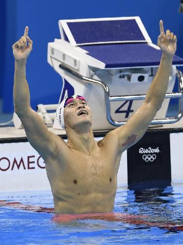 8月8日,孙杨夺冠后庆祝。当日,在2016年里约奥运会游泳比赛男子200米自由泳决赛中,中国选手孙杨以1分44秒65的成绩夺冠。 新华社记者戚恒摄