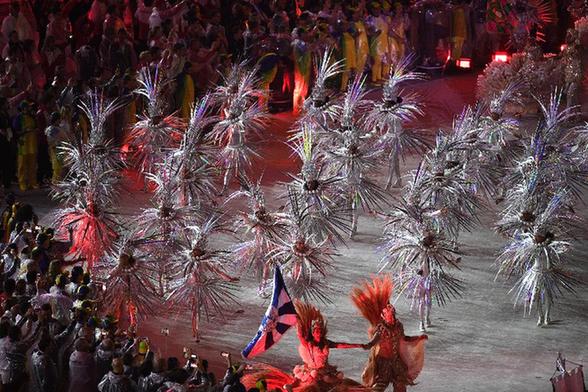 运动员入场由演员扮演的巴西著名歌星卡门·米兰达引导。在旗手丁宁的引领下,中国奥运健儿与其他代表团的运动员一起欢快地步入场地,与弗雷沃舞蹈演员共同舞动,运动员和看台上不停掀起人浪的观众一起成为这场演出的主角。