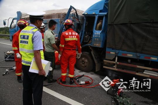 医务人员一到现场就给一时不能救出的伤者进行治疗。事故中队民警进行现场勘查,力争早点恢复通行。从通海赶来救援的通海消防官兵,一到现场就投入救人行列,使用破坏钳、切割机等设备钳断和切割两车相互交错在一起的车身、保险杆、车门。