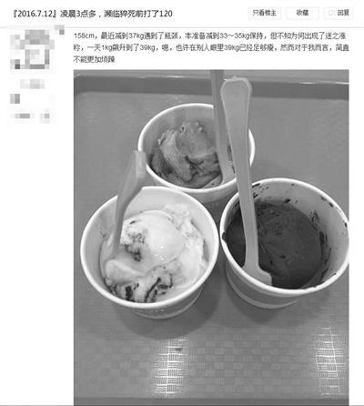另一种是晒体重,体重都在极轻范围。一位身高170厘米的人,目标体重是70斤,她说自己124斤时,走在大街上完全不敢抬头,觉得没脸见人。