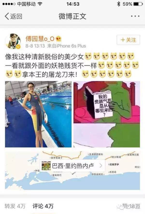 2016年8月8日,里约热内卢奥运会第2日,作为2015年世锦赛50米仰泳冠军,游泳队最强段子手傅园慧寻求奥运会的突破。在里约奥运女子100米仰泳半决赛中,选手傅园慧以58秒95、排名第三的成绩晋级决赛。本以为傅园慧是个高冷Girl,却没想到她在赛后接受采访时,频频爆出金句,同时还贡献了无数高品质高水准高能量的表情包。