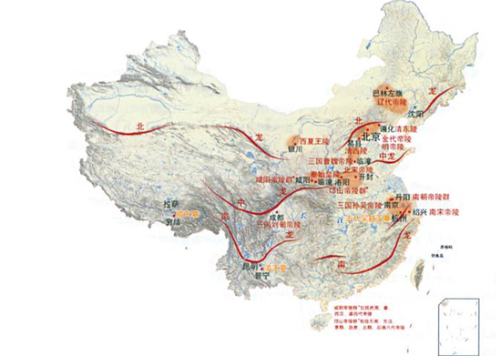 中国帝王陵分布图:从中国的地理形势上看,每隔8o就有一条大的纬向构造。热衷风水术的唐宋开始在群山中寻找“龙脉”,认为这些群峰跌宕起伏、厚实且藏风聚气,是风水宝地,龙脉集结处更佳。中国历代帝王都不约而同地把陵墓确定在这些地方。