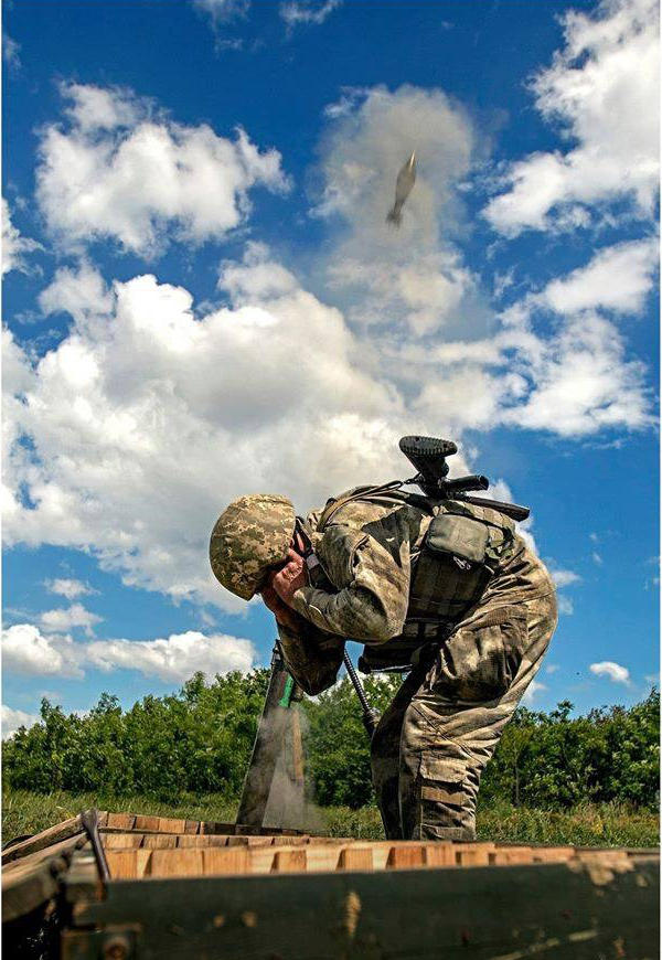 乌克兰知名摄影师德米特里·穆拉夫斯基近日在其“脸谱”个人主页上传了一组顿巴斯战地照片,真实再现了乌东部战争的血腥与残酷。照片的拍摄地点位于顿巴斯南部的希罗基诺村,是乌政府军与东部独立武装交火的最前线。图为乌军士兵双手掩耳,一发炮弹飞越他的头顶。
