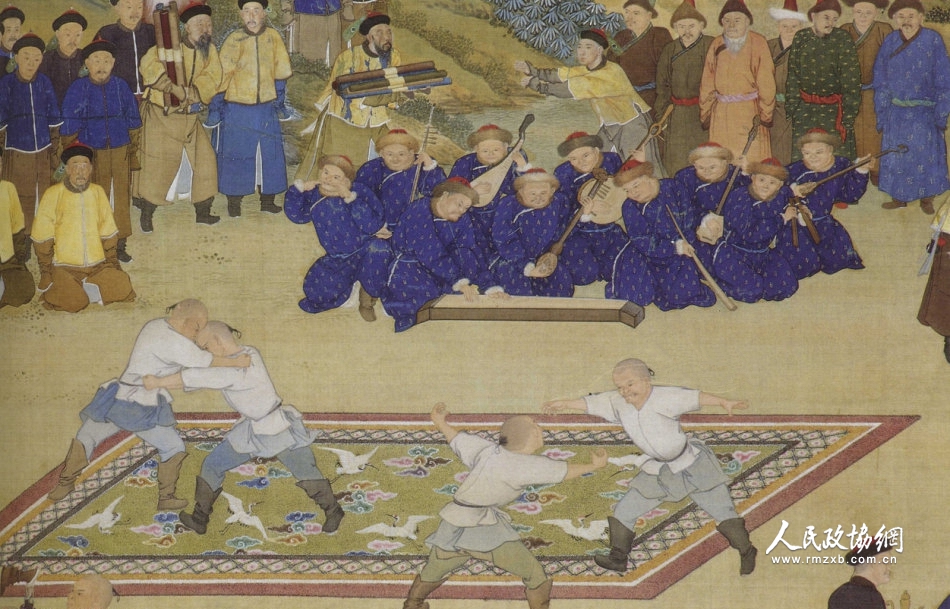 到清代,角抵开始与满族民俗相交融,并被称为“布库”。由于宫廷支持,这项运动又逐渐走向新高潮?!吧破擞背莆笔鼻逋⒆殴芾斫堑值幕?,同时也出现了专职的“布库手”,其单以角抵为职,研究和练习摔跤。这在清代画家郎世宁创作的《塞宴四事图》中即有描绘。每年腊月二十三日,其会在养心殿前举行比赛。按画中所示,参与比赛的四人两两对抗,气氛紧张。