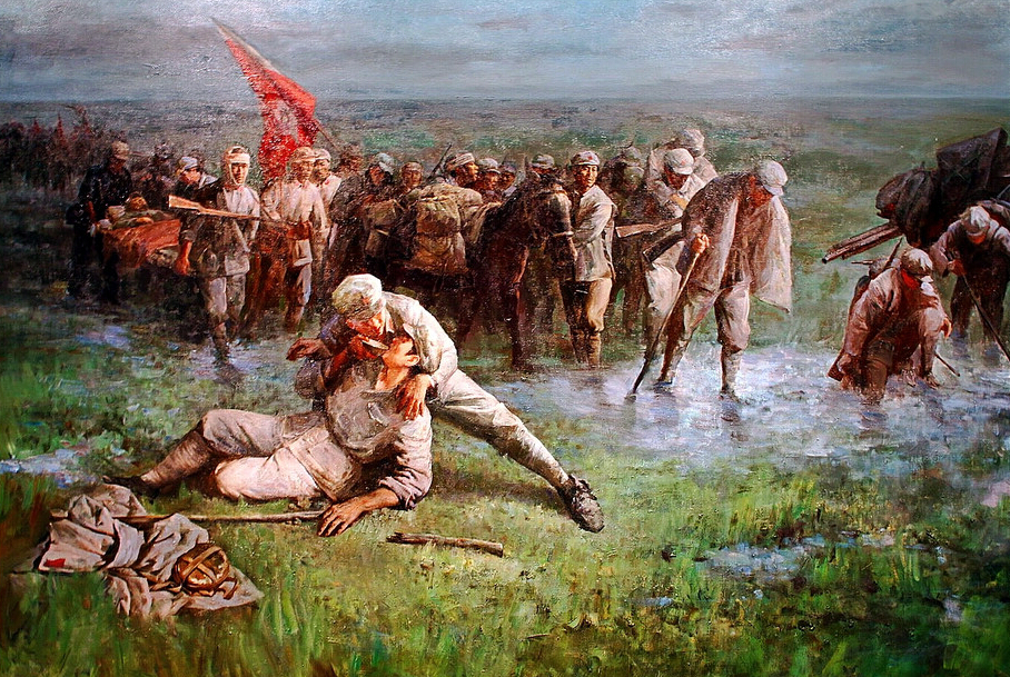 红三军某连的炊事班共有9名战士。进入草地后,为使全连同志有热水喝、有热水烫脚,炊事员轮流挑着那口沉重的铜锅。一个炊事员倒在锅旁,第二个炊事员含泪挑起锅,继续走下去。一个、一个……炊事班的同志都倒下了。