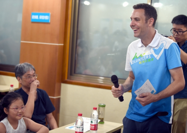 来自浙江大学的志愿者、澳大利亚留学生提姆在杭州东山弄社区教居民学英语(8月2日摄)。