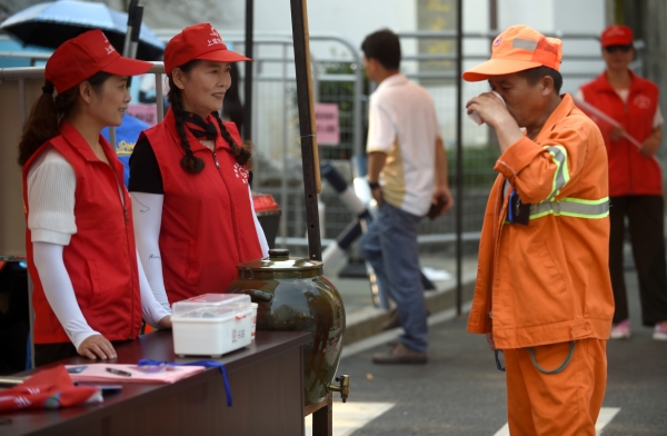 8月24日,来自杭州清波街道的志愿者陈林娟(左二)和同伴在杭州柳浪闻莺景区入口处为游客和市民提供免费凉茶。