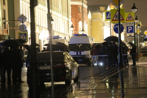 8月24日,在俄罗斯首都莫斯科,警方车辆停在事发银行附近。