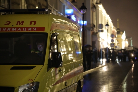 8月24日,在俄罗斯首都莫斯科,一辆救护车停在事发银行附近。