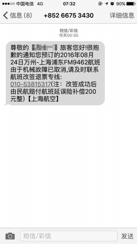 昨天,重庆女孩小文告诉记者,她在上海华东师范大学读大二。7月份,她花800元通过第三方平台购买了8月24日上午11点半自重庆万州飞往上海浦东的FM9462航班。昨天早上6点左右,她收到一个来自“+85266753430”的短信,内容为她预订的航班因机械故障已取消,要求她拨打航班改签退票专线联系。