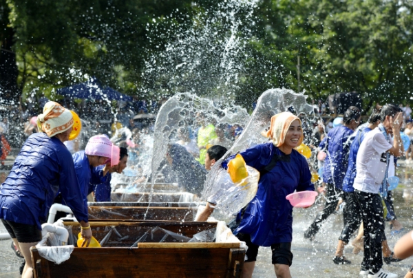 8月24日,在贵州省榕江县三宝侗寨,侗族群众与游客在戏水狂欢。
