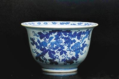 松鼠葡萄纹青花盆。这是一只产于清代乾隆年间的青花花盆,敞口、直腹、圈足,口径25.5厘米,高15.5厘米,上面绘制的正是松鼠葡萄纹图案?;ㄅ璧撞坑兄本对?.4厘米的圆形钻孔。