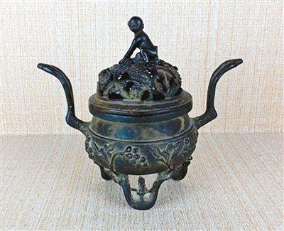 鼠戏葡萄铜熏炉。该熏炉为清末之物,总高17.5厘米,造型和西汉极其流行的博山炉相似,底下有三足支撑,两边有两条外撇的“翅膀”。熏炉的外壁上, 有葡萄纹,炉盖上雕有小老鼠和葡萄堆,只见小老鼠鬼鬼祟祟地在葡萄间若隐若现。而盖钮,则做成一只半蹲在葡萄堆上的小猴子。猴子的神情十分警觉,像是在守 护着丰收的果实。葡萄堆有丰收之意,猴谐音“侯”,有封侯之意。