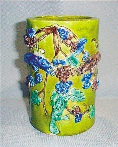 松鼠葡萄瓷雕笔筒。瓷雕是我国的一种独特工艺,是雕刻师巧妙雕工和窑火完美结合的产物。这件清代瓷雕笔筒,高12.8厘米,口径8.2厘米,上面采用 高浮雕的形式,雕刻有松鼠葡萄图案。笔筒的背景为浅绿色,葡萄藤为黑灰色,葡萄叶为绿色,密密匝匝的葡萄和聪明伶俐的松鼠或为黑色,或为紫色,设计错落有 致,凸凹有形,立体感很强。