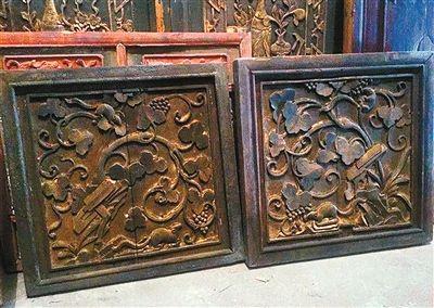 鼠戏葡萄红木花板。在古代,木雕花板由于能在门窗家具上进行广泛应用,又能表达丰富的主题,因此受到欢迎,尤其是在红木家具较为流行的明清,木雕花板 更为普遍。这对清代的红木雕花板,各自长64.7厘米,宽53.9厘米,应用在旧式木门上,上面的图案便是鼠戏葡萄。(黑王辉)